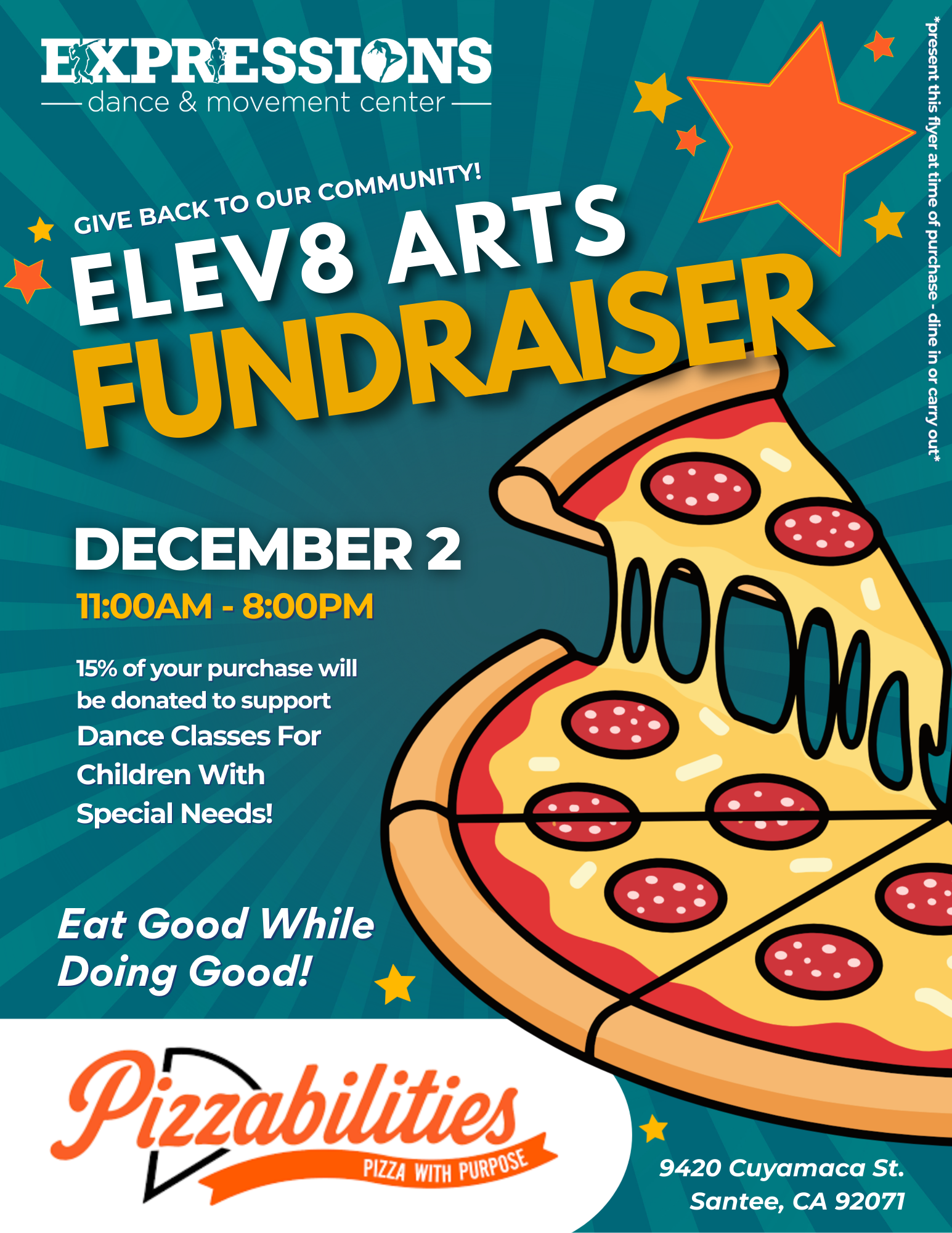 At Expressions Dance & Movement Center we believe in the power of dance to change lives. We want everyone to be able to experience the benefits of a nurturing dance environment. That's why we partner with Elev8 Arts Foundation, a local 501(c)(3) organization dedicated to bringing arts education to children & teens in East County San Diego!